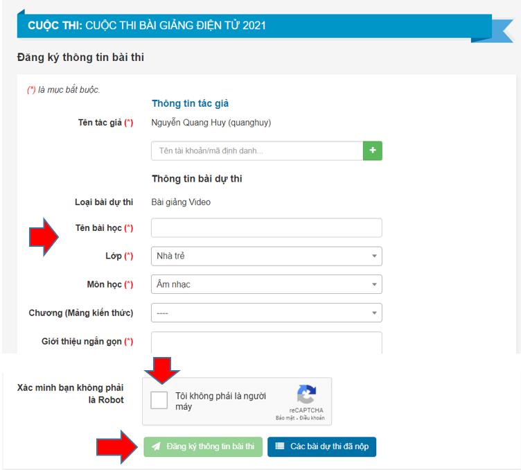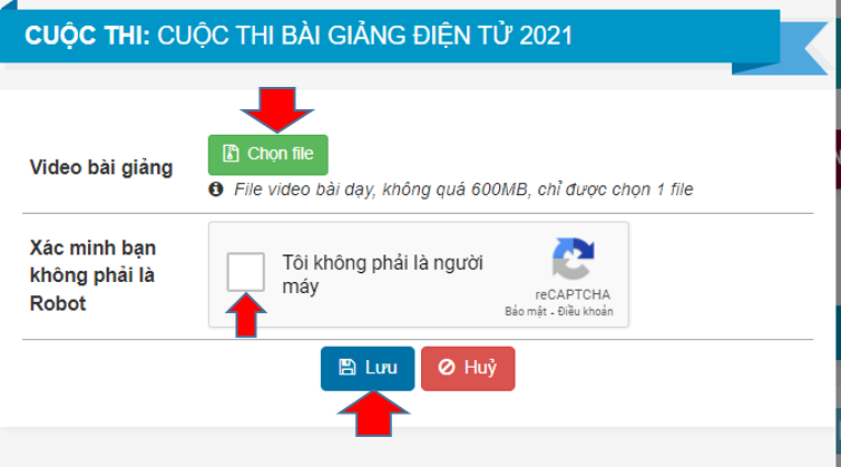 Giáo viên nhấn nút Chọn file rồi tìm file bài dự thi mình muốn gửi sau đó nhấn vào phần Xác minh bạn không phải là Robot, làm theo hướng dẫn rồi nhấn Lưu