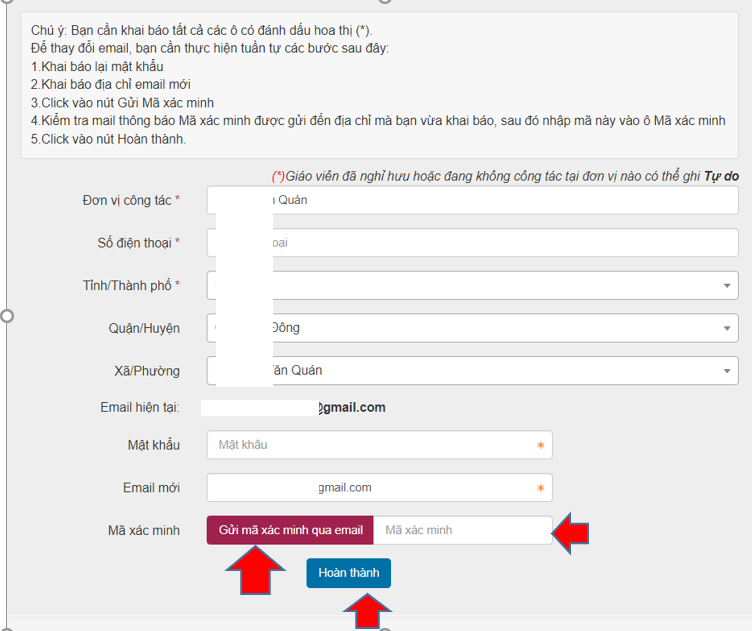Bước 6: Giáo viên mở email, lấy mã xác minh và điền vào ô Mã xác minh rồi nhấn nút Hoàn thành