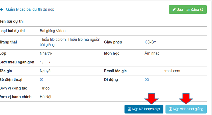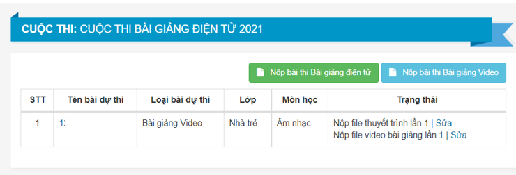 Sau khi nộp xong bài hệ thống sẽ hiển thị các thông tin bài dự thi và trạng thái nộp file. Giáo viên có thể sửa (thay đổi file)