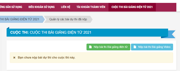 Để tham gia Cuộc thi bài giảng điện tử 2021 mỗi giáo viên cần có tài khoản đăng nhập và mật khẩu, tài khoản và mật khẩu này được Bộ Giáo dục và Đào tạo gửi về trường thông qua hệ thống Cơ sở dữ liệu ngành. Xem Hướng dẫn nhà trường lấy tài khoản đăng nhập cho giáo viên tham gia Cuộc thi bài giảng điện tử 2021 tại đây2. Hướng dẫn nộp bài